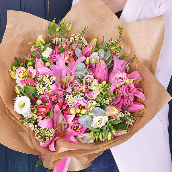 лилия розовая – 1 шт., альстромерия розовая – 2 шт., эустома розовая – 2 шт., эусома белая – 2 шт., хамелациум белый – 1 шт., зелень декоративная (эвкалипт), упаковка, лента.