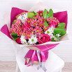 роза розовая  –  3 шт., хризантема белая кустовая – 1 шт., хризантема розовая кустовая – 1 шт., зелень декоративная (салал), упаковка крафт, лента.